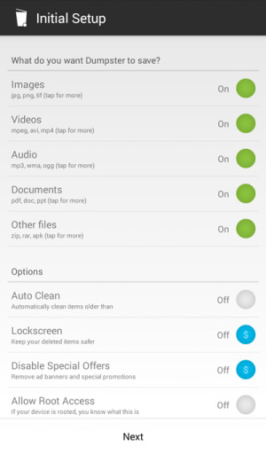 3. In the initial setup page, select all the files types that you want the app to save when they are deletedand tap on ‘Next’ button.