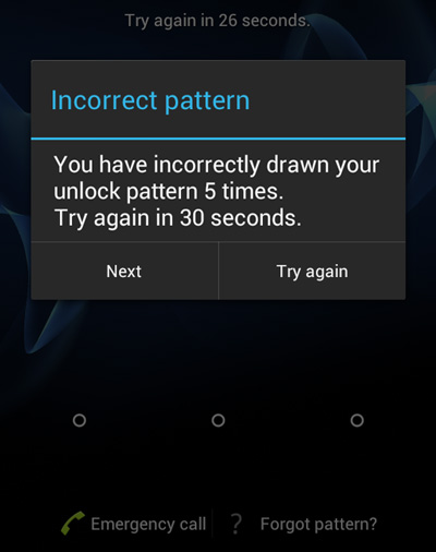 - Incorrectly enter your pattern for 5 times. On the fifth attempt, you will get a message informing you that you must wait for 30 seconds before you can try again. Tap ‘Next’ and a button will appear underneath the pattern grid that says ‘Forgot Pattern’. Tap on it.