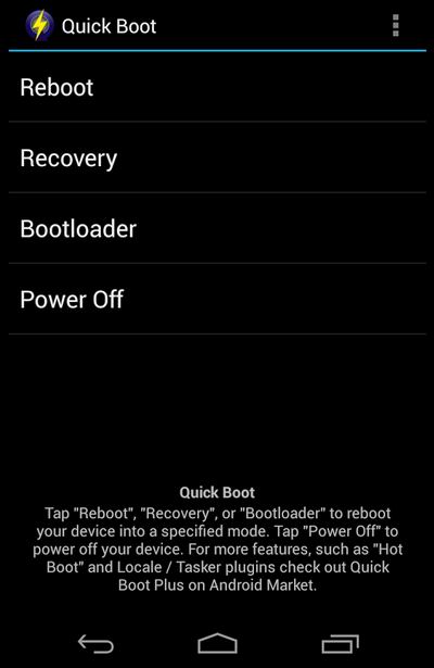 Alternatively, you can use a third-party app called Quick Boot to access the recovery mode. The app lets you boot your device into recovery with just a few click. This will be extremely helpful if you don’t know the key combination to enter into the recovery mode on your android device. However, it requires root access which means you need to root your device.